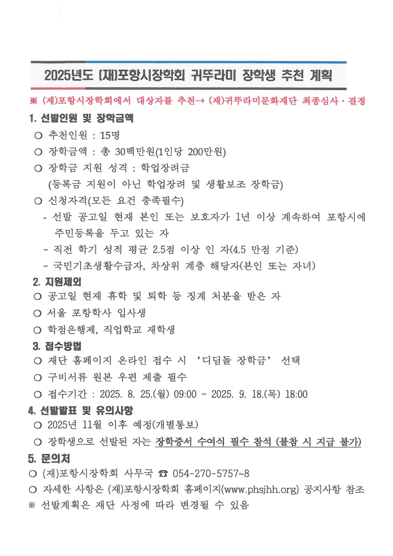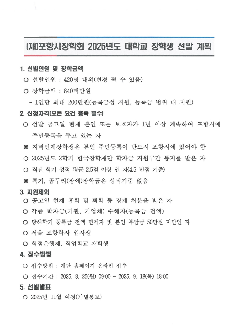 | 제목 | 2025년도 (재)포항시장학회 장학생 선발 안내 | ||||