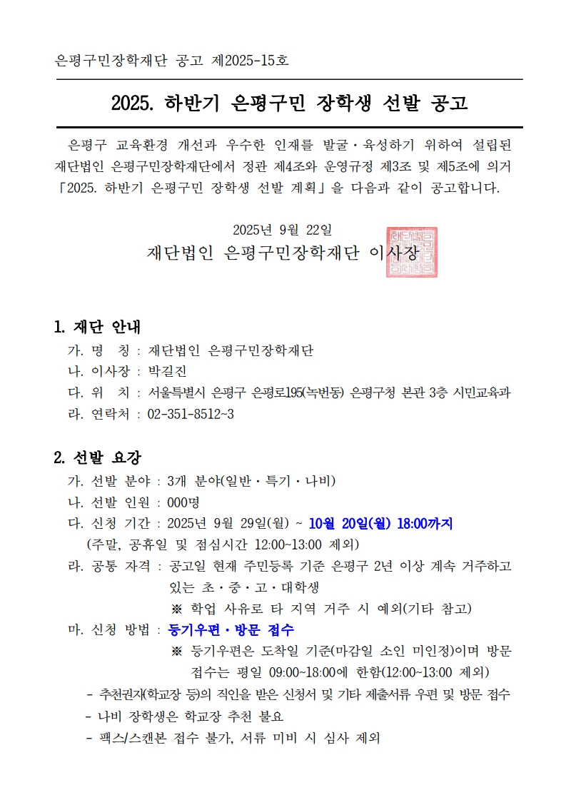 | 제목 | 2025 하반기 은평구민 장학생 선발 안내 | ||||