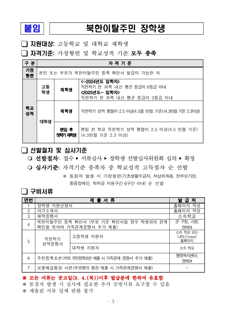 | 제목 | 2025년도 하반기 북한이탈주민 장학생 선발 재공고(추가모집) | ||||