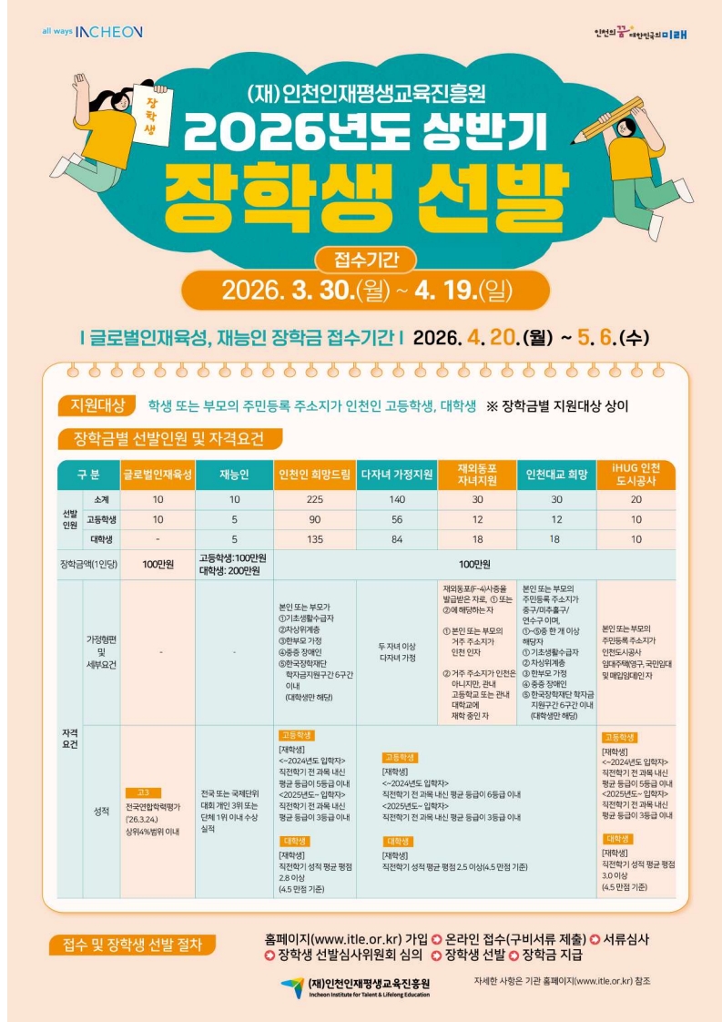 | 제목 | (재)인천인재평생교육진흥원 2026년도 상반기 장학생 선발 안내 | ||||
