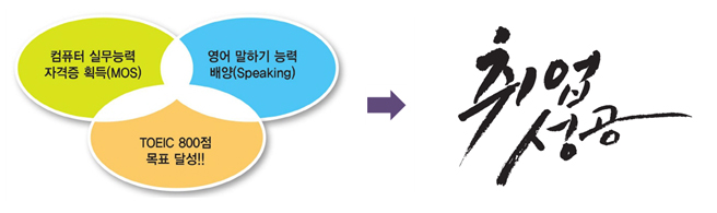 취업하는데 있어서 가장 중요한 세 가지 요소!! 컴퓨터 자격증, TOEIC 점수, 영어 말하기 능력을 신입생 때부터 미리 학습함으로써