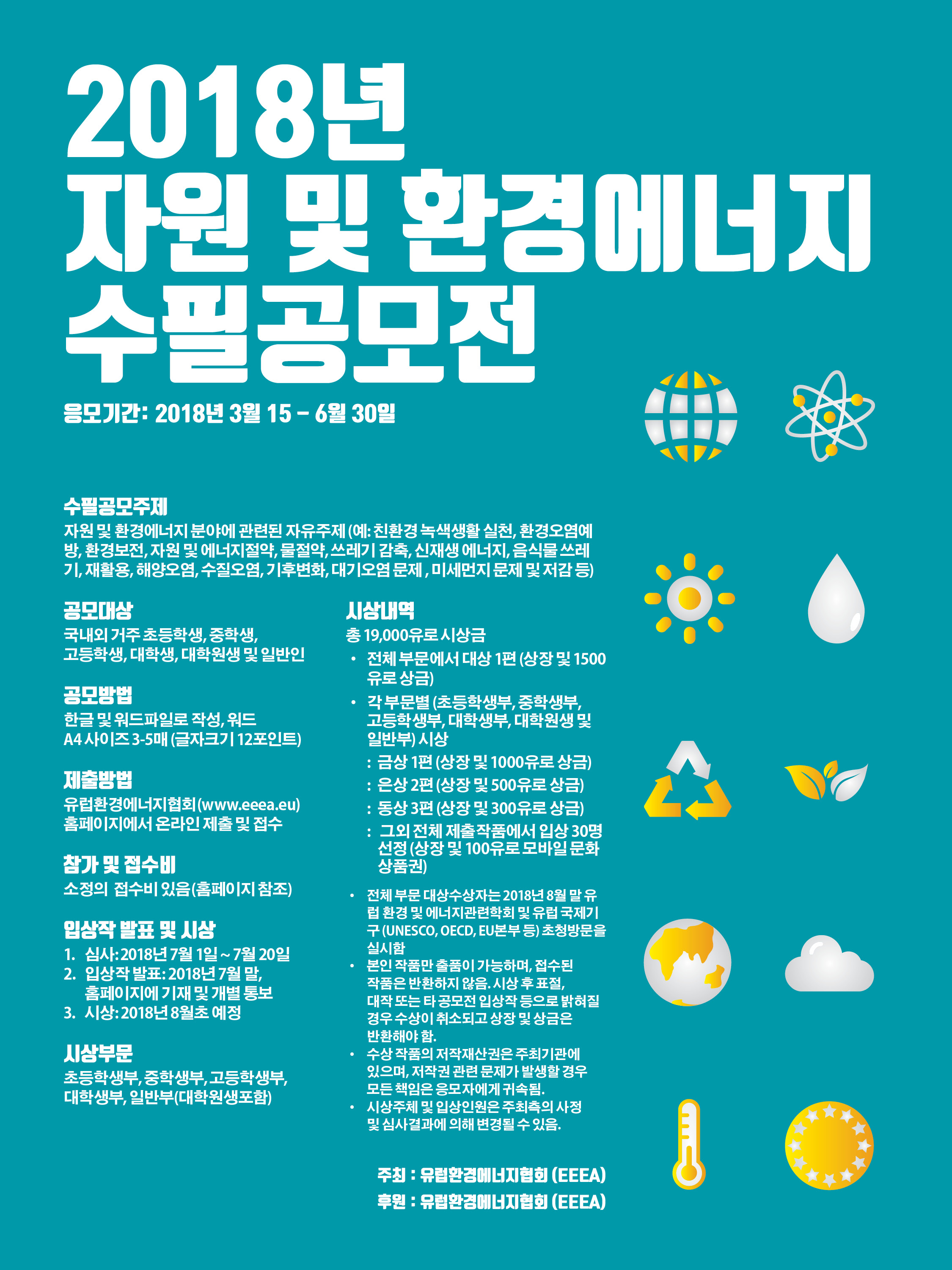 응모기간 2018년 3월 15 ~ 6월 30일 2. 수필공모주제 자원 및 환경에너지 분야에 관련된 자유주제 (예: 친환경 녹색생활 실천, 환경오염예방, 환경보전, 자원 및 에너지절약, 물절약, 쓰레기 감축, 신재생 에너지, 음식물 쓰레기, 재활용, 해양오염, 수질오염, 기후변화, 대기오염 문제, 미세먼지 문제 및 저감 등) 3. 공모대상 국내외 거주 초등학생, 중학생, 고등학생, 대학생, 대학원생 및 일반인 4. 공모방법 한글 및 워드파일로 작성, 워드 A4사이즈 3-5매 (글자크기 12포인트) 5. 참가 및 접수비 소정의 접수비 있음 (홈페이지 참조) 6. 입상작 발표 및 시상 - 심사기간 : 2018년 7월 1일 ~ 7월 20일 - 입상작 발표 : 2018년 7월 말, 홈페이지에 기재 및 개별 통보 - 시상식 : 2018년 8월초 예정 - 시상내역 : 총 19,000유로 시상금 전체 부문에서 대상 1편 (상장 및 1500유로 상금)* 각 부문별 (초등학생부, 중학생부, 고등학생부, 대학생부, 대학원생 및 일반부) 시상 : 금상 1편 (상장 및 1000유로 상금) : 은상 2편 (상장 및 500유로 상금) : 동상 3편 (상장 및 300유로 상금) : 그 외 전체 제출작품에서 입상 30명 선정 (상장 및 100유로 모바일 문화상품권) * 전체 부문 대상수상자는 2018년 8월 말 유럽 환경 및 에너지관련학회 및 유럽 국제기구 (UNESCO, OECD, EU본부 등) 초청방문을 실시함 7. 제출방법 유럽환경에너지협회 홈페이지 (http://www.eeea.eu/essay-cont 8. 기타 - 본인 작품만 출품이 가능하며, 접수된 작품은 반환하지 않음. 시상 후 표절, 대작 또는 타 공모전 입상작 등으로 밝혀질 경우 수상이 취소되고