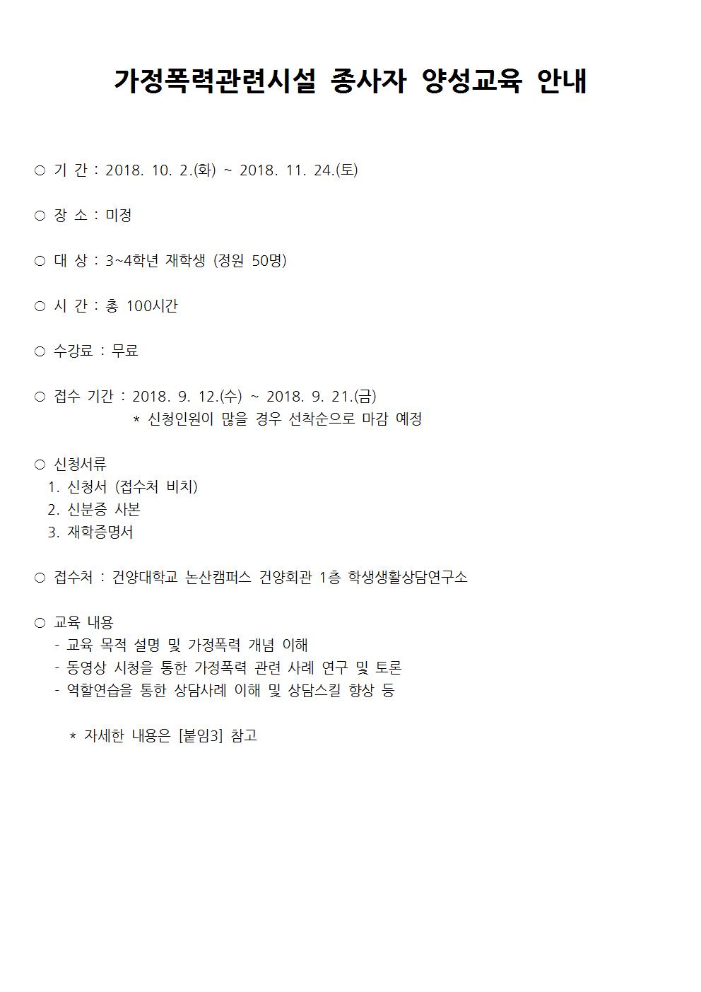 | 제목 | 가정폭력관련시설 종사자 양성교육 안내 | ||||