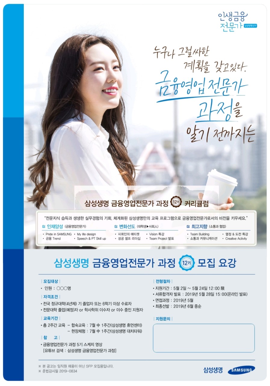 | 제목 | 2019 삼성생명 금융영업전문가 과정 12기 모집 | ||||