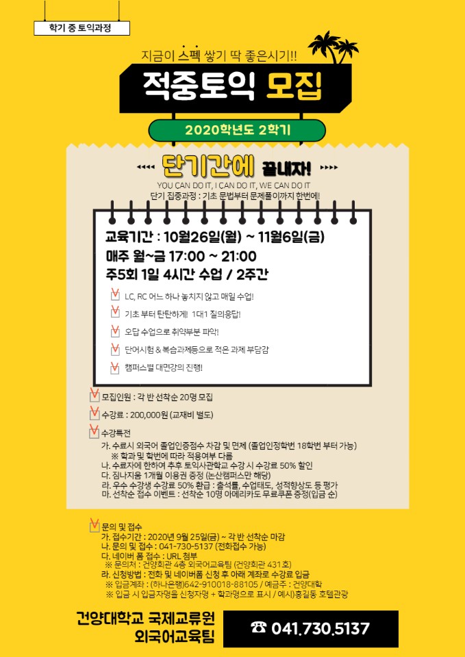 2020학년도 2학기 적중토익 수강생을 추가 모집하오니 많은 관심 부탁드립니다.