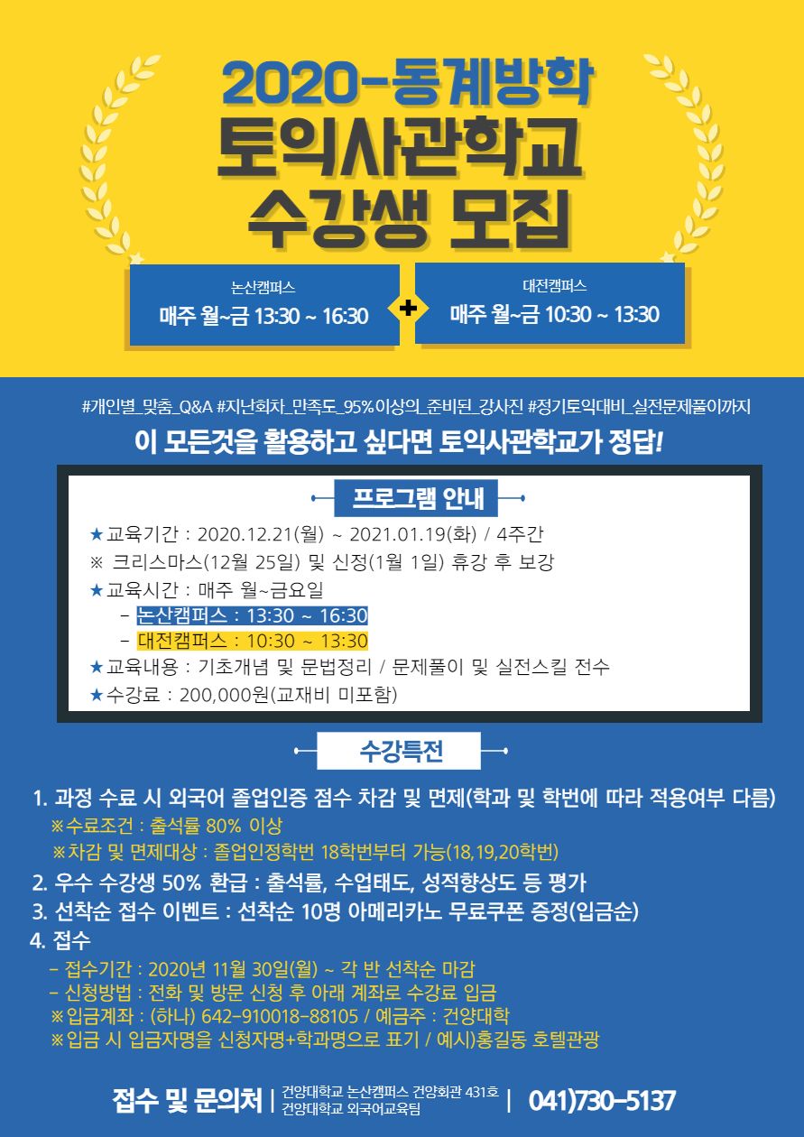 | 제목 | 2020학년도 동계 토익사관학교 수강생 모집 | ||||