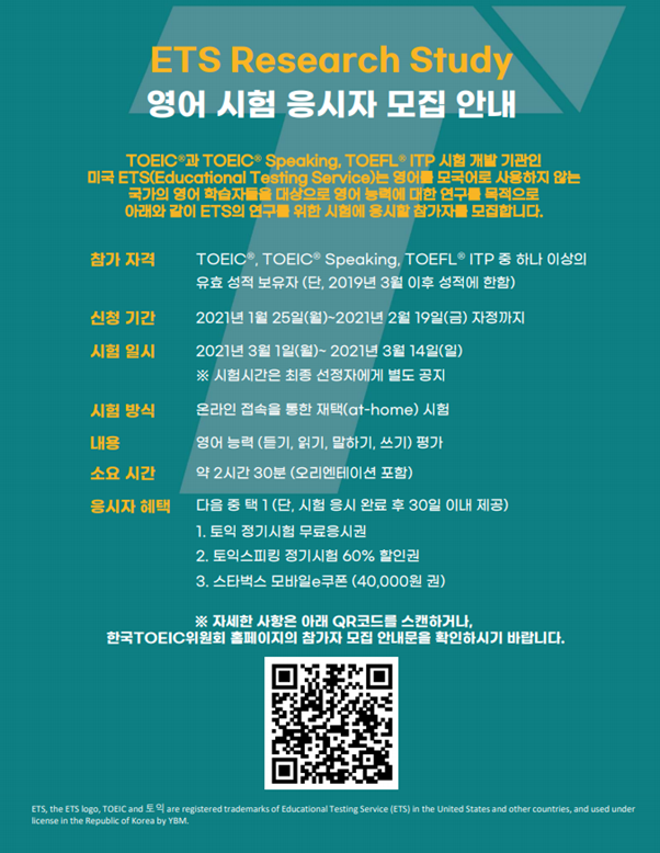 | 제목 | ETS Research study 영어 시험 응시자 모집 안내 | ||||