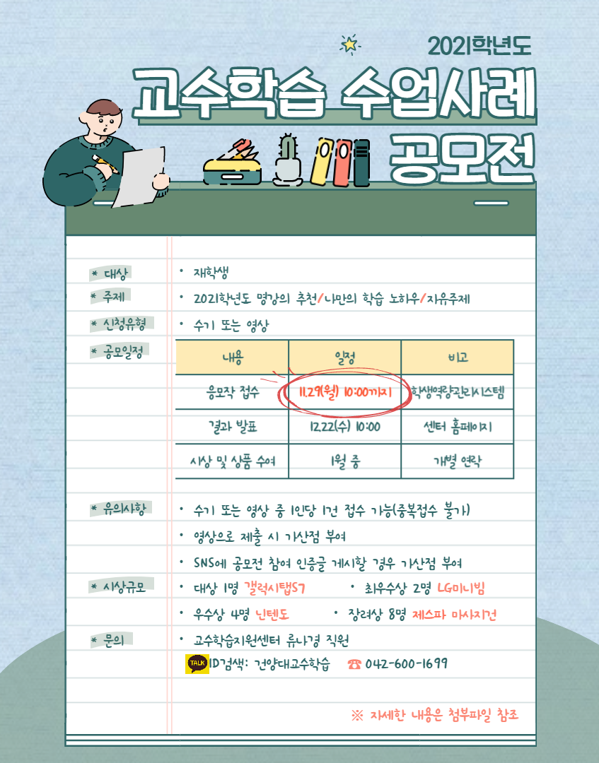 교수학습지원센터에서는 공부방법 및 학습능력 향상을 위한 노하우 공유를 위해 수업사례 공모전을 개최합니다. 많은 관심과 참여 부탁드립니다. :)