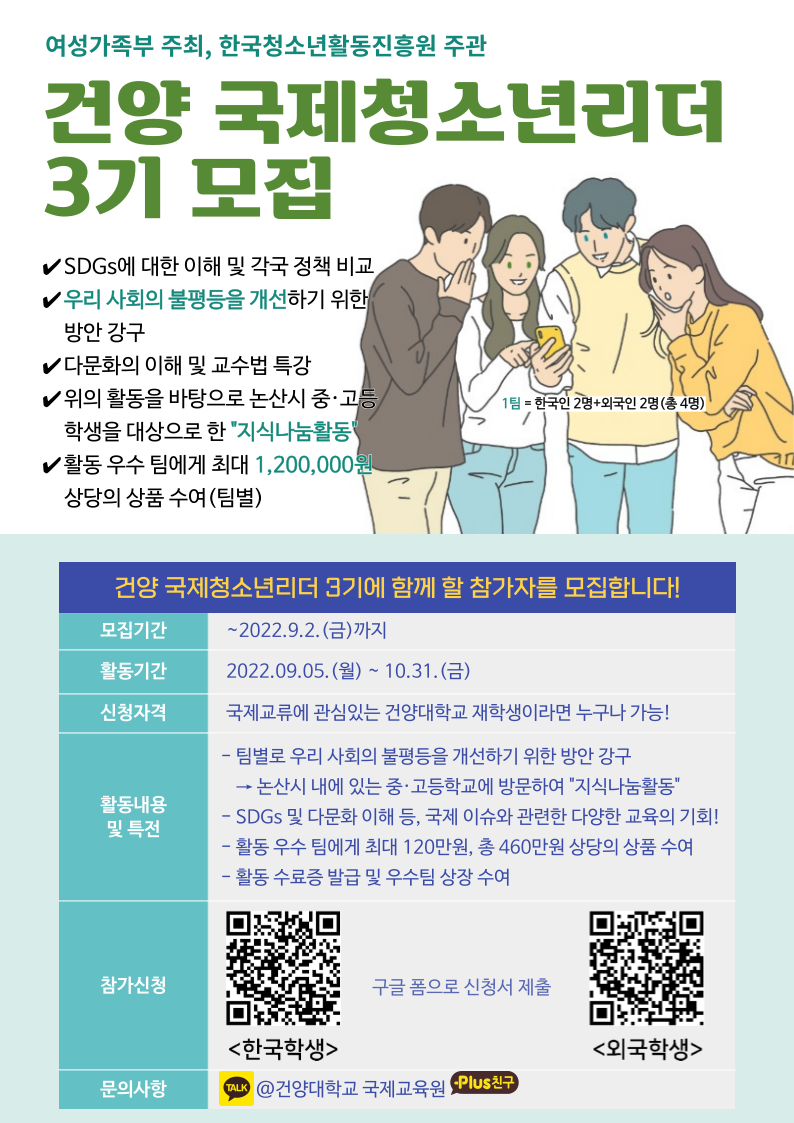 건양 국제청소년리더 3기에 함께 할 참가자를 모집합니다! (한국학생) https://forms.gle/tAUjGNRFd11vfekh6 (외국학생) https://forms.gle/MFGZHyDXiZ55chca8