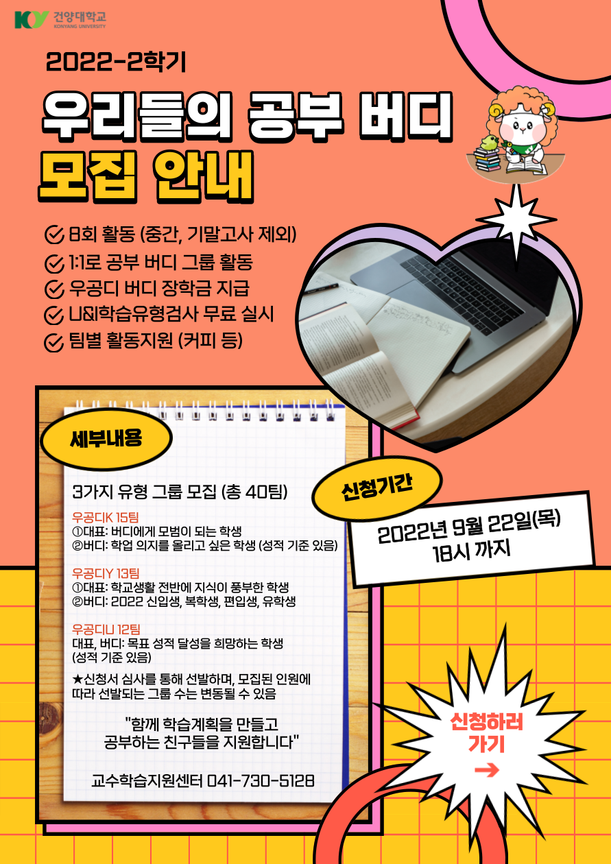 | 제목 | 2022-2학기 우리들의 공부 버디(우공디) 그룹 모집 안내 | ||||