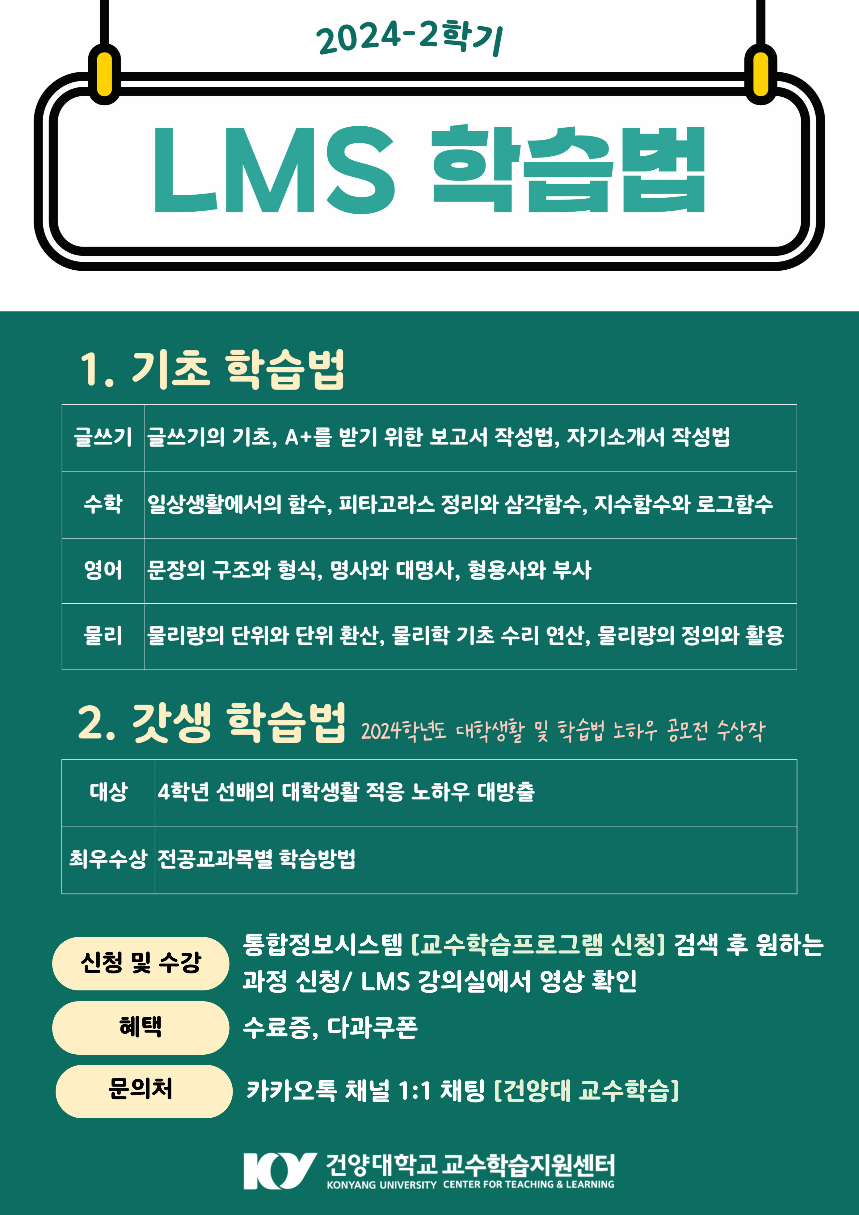 1. 기초학습법: 글쓰기, 수학, 영어, 물리 2. 갓생학습법: 4학년 선배의 대학생활 적응 노하우 대방출, 전공교과목별 학습방법 * 2024학년도 대학생활 및 학습법 노하우 공모전 수상작 ○ 신청 및 수강: 통합정보시스템 [교수학습프로그램 신청] 검색 후 원하는 과정 신청/ LMS 강의실에서 영상 확인 ○ 혜택: 수료증, 다과 ○ 문의처: 카카오톡 채널 1:1 채팅 [건양대 교수학습]