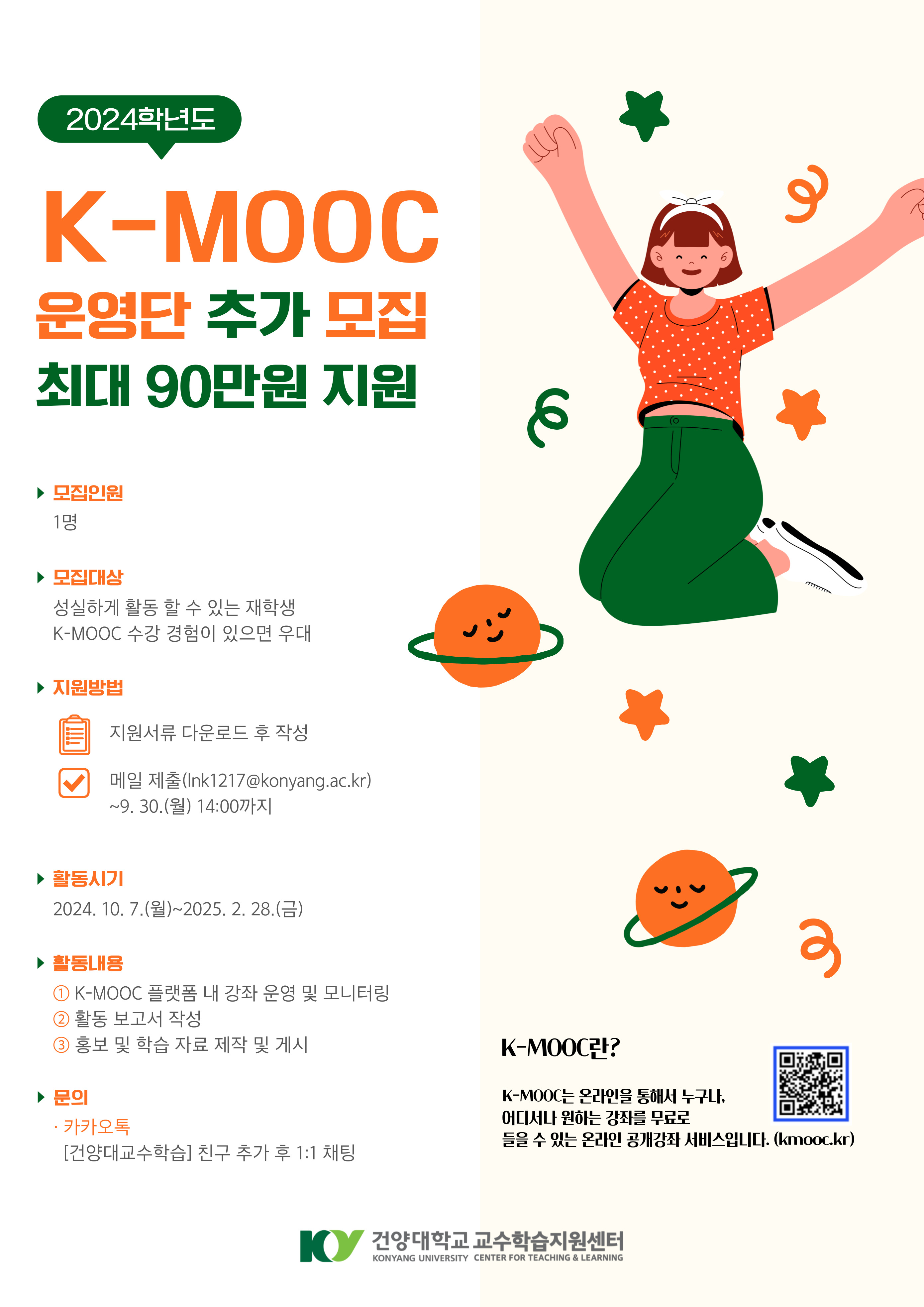 ○ 모집인원: 1명 ○ 모집대상: 성실하게 활동 할 수 있는 재학생(K-MOOC 수강 경험이 있으면 우대) ○ 지원방법: 지원서류 다운로드 후 작성하여 메일 제출(lnk1217@konyang.ac.kr)/ ~9.30(월) 14:00까지 ○ 활동시기: 2024. 10. 7.(월)`2025. 2. 28.(금) ○ 활동내용 - K-MOOC 플랫폼 내 강좌 운영 및 모니터링 - 활동 보고서 작성 - 홍보 및 학습 자료 제작 및 게시 ○ 문의: 카카오톡 [건양대교수학습] 친구 추가 후 1:1 채팅