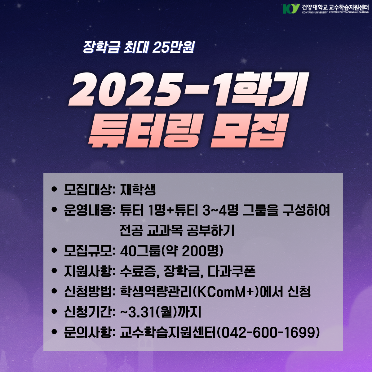 - 대상: 재학생 - 운영내용: 튜터링 과목(2025-1학기 개설된 전공교과목)에 대한 7회차 이상 그룹 학습 후 보고서 제출 - 모집규모: 40그룹(약 200명) - 지원사항: 장학금(최대 25만원), 수료증, 다과쿠폰 - 신청방법: 학습역량관리(KComM+) 신청서 제출 (신청하러가기) - 신청기간: ~3.31(월)까지 - 문의처: 카카오톡 채널 1:1 채팅 [건양대 교수학습]
