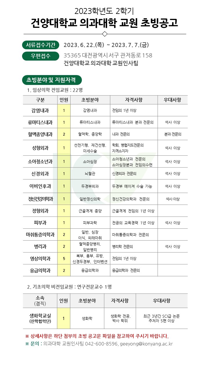 | 제목 | 2023학년도 2학기 건양대학교 의과대학 교원 초빙공고 | ||||