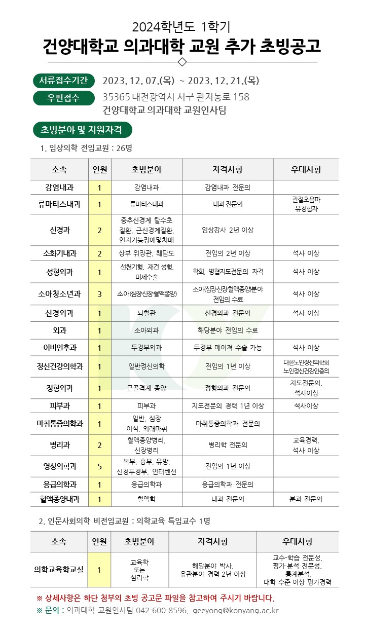 | 제목 | 2024학년도 1학기 건양대학교 의과대학 교원 추가 초빙공고 | ||||
