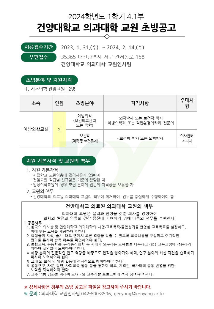 | 제목 | 2024학년도 1학기 4.1부 건양대학교 의과대학 전임교원 초빙공고 | ||||