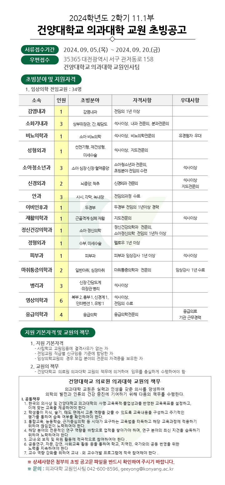 | 제목 | 2024학년도 2학기 11.1부 건양대학교 의과대학 교원 초빙공고 | ||||