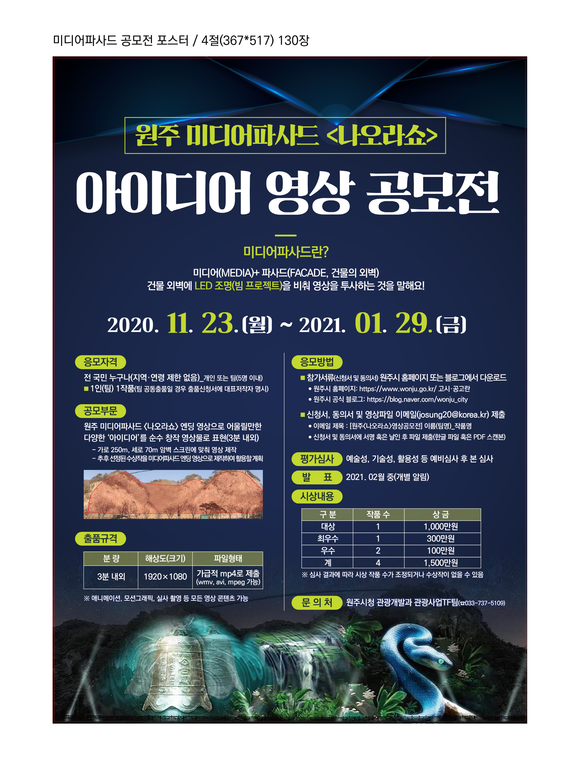 | 제목 | 원주 미디어파사드 <나오라쇼> 아이디어 영상 공모전 안내 | ||||