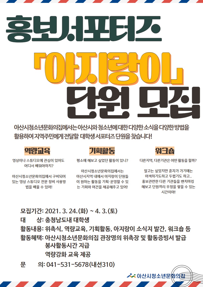 | 제목 | 아산시청소년문화의집 청소년서포터즈단 「아지랑이」단원 모집 안내 | ||||