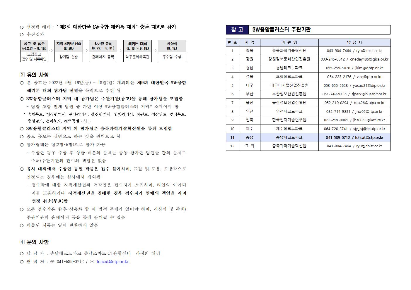 | 제목 | 제9회 대한민국 SW융합 해커톤 대회 충남예선 참가 안내 | ||||