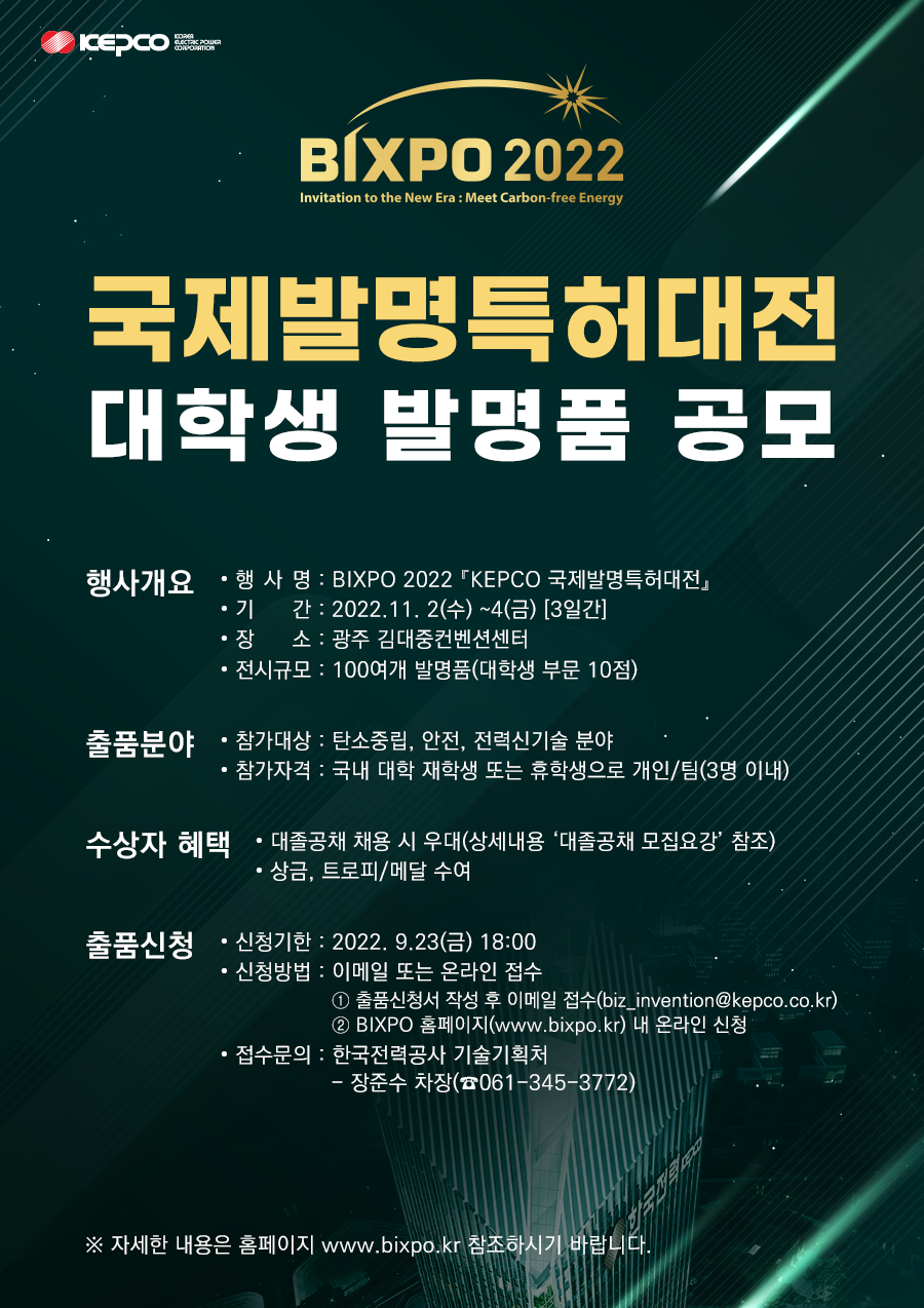 | 제목 | BIXPO 2022「KEPCO 국제발명특허대전」참가 안내 | ||||