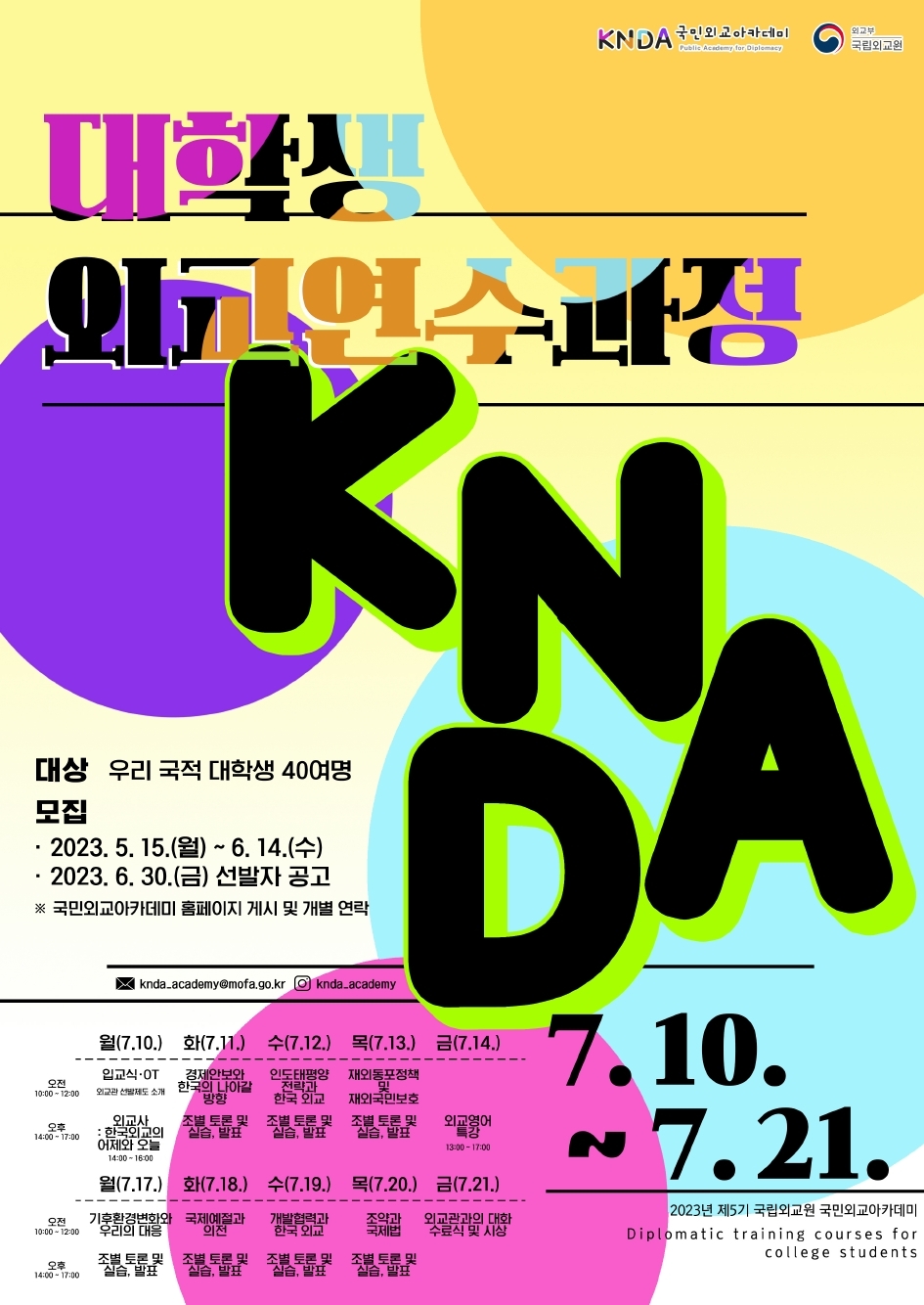| 제목 | 제5기 국립외교원 국민외교아카데미 대학생 외교 연수 과정 참가자 모집 안내 | ||||