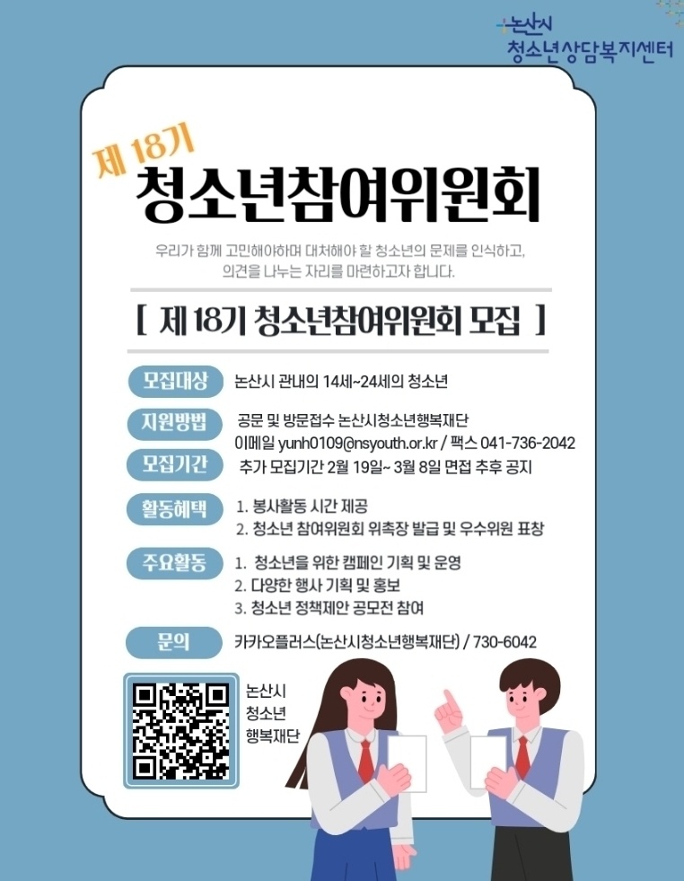 | 제목 | 제18기 논산시청소년참여위원회 위원 추가모집 안내 | ||||