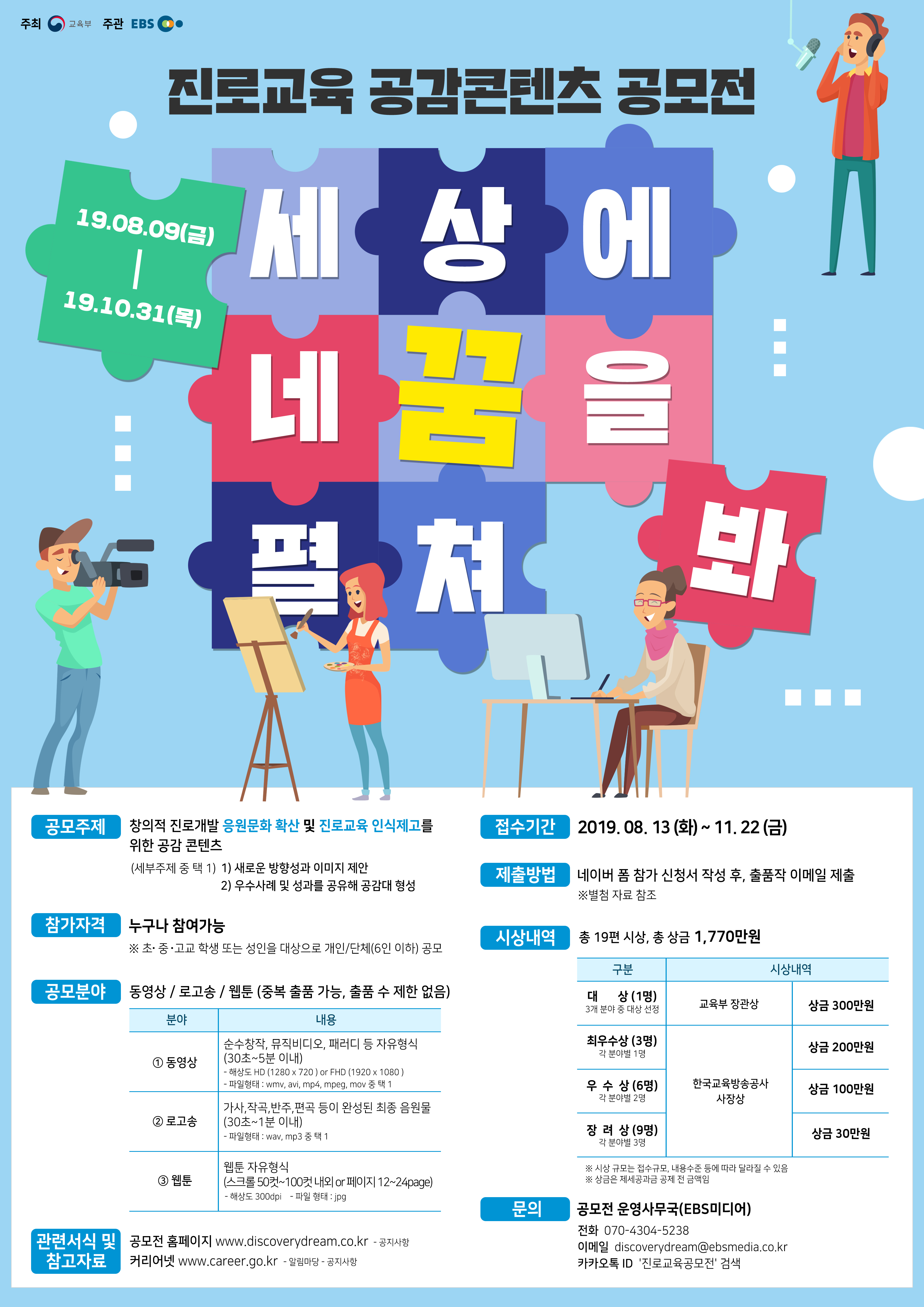 | 제목 | 2019년 진로교육 공감콘텐츠 공모전 세상에 네 꿈을 펼쳐봐 공모전 안내 | ||||