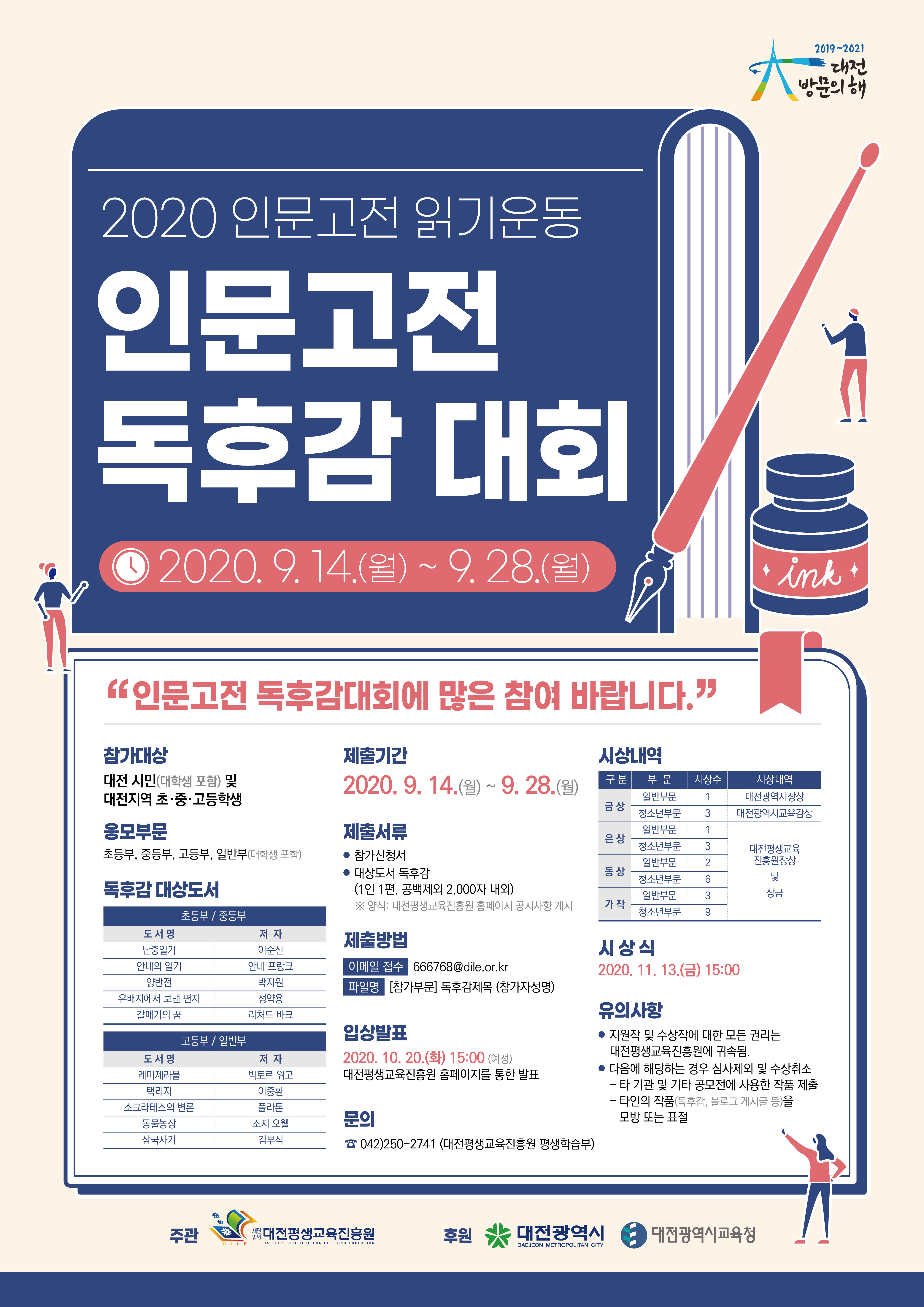 | 제목 | 대전평생교육진흥원 2020년 인문고전 독후감 대회 안내 | ||||
