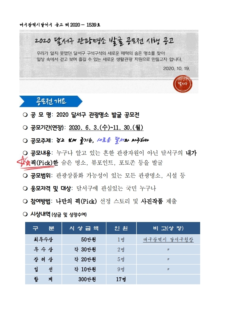 | 제목 | 2020 달서구 관광명소 발굴 공모전 안내 | ||||