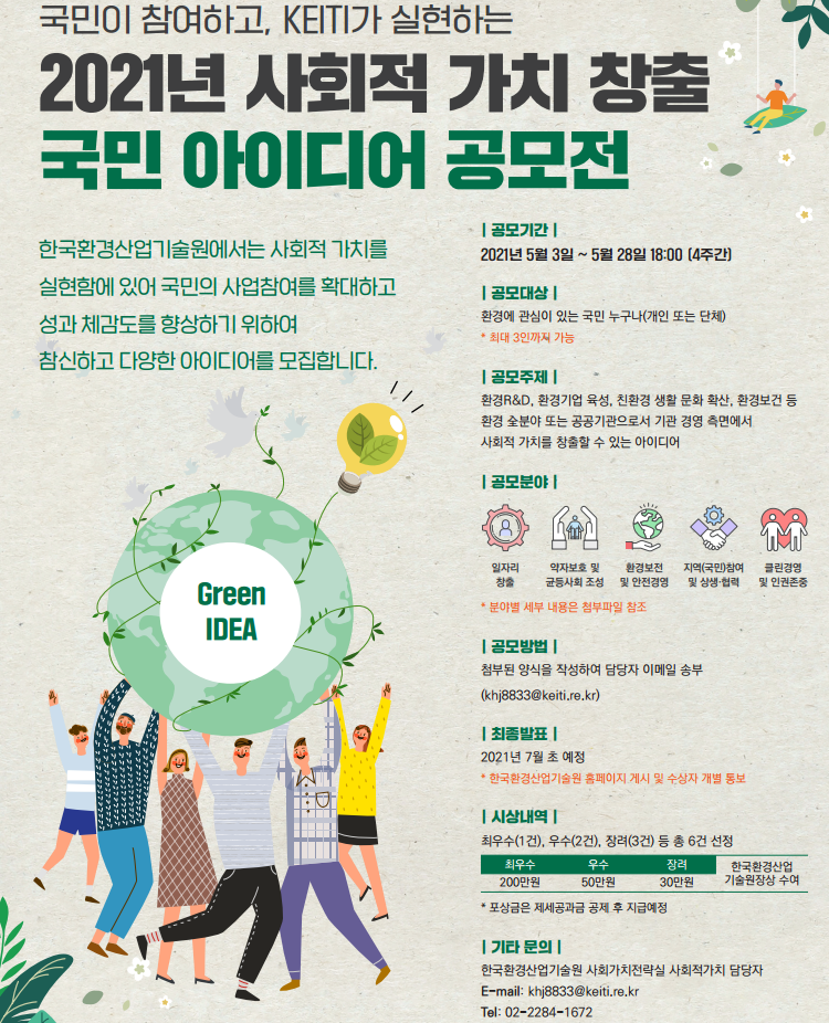 | 제목 | 2021년 사회적 가치 창출 국민 아이디어 공모전 안내 | ||||