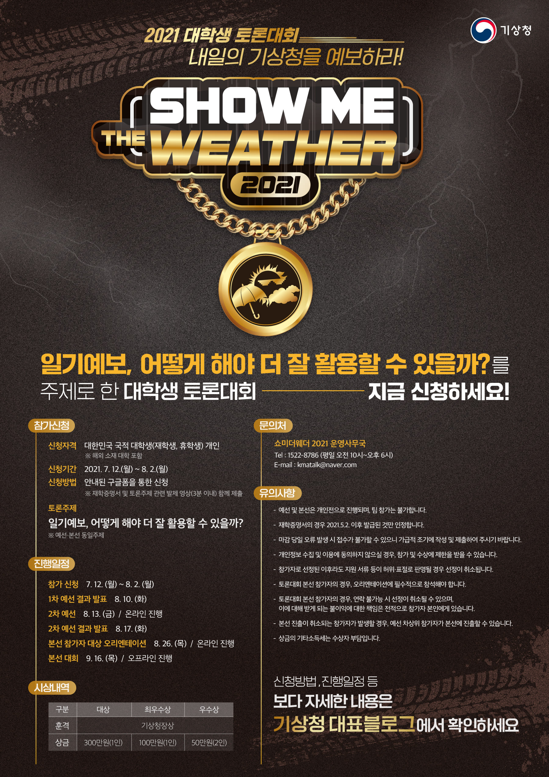 | 제목 | 기상청 대학생 토론대회 '쇼미더웨더 2021' 안내 | ||||