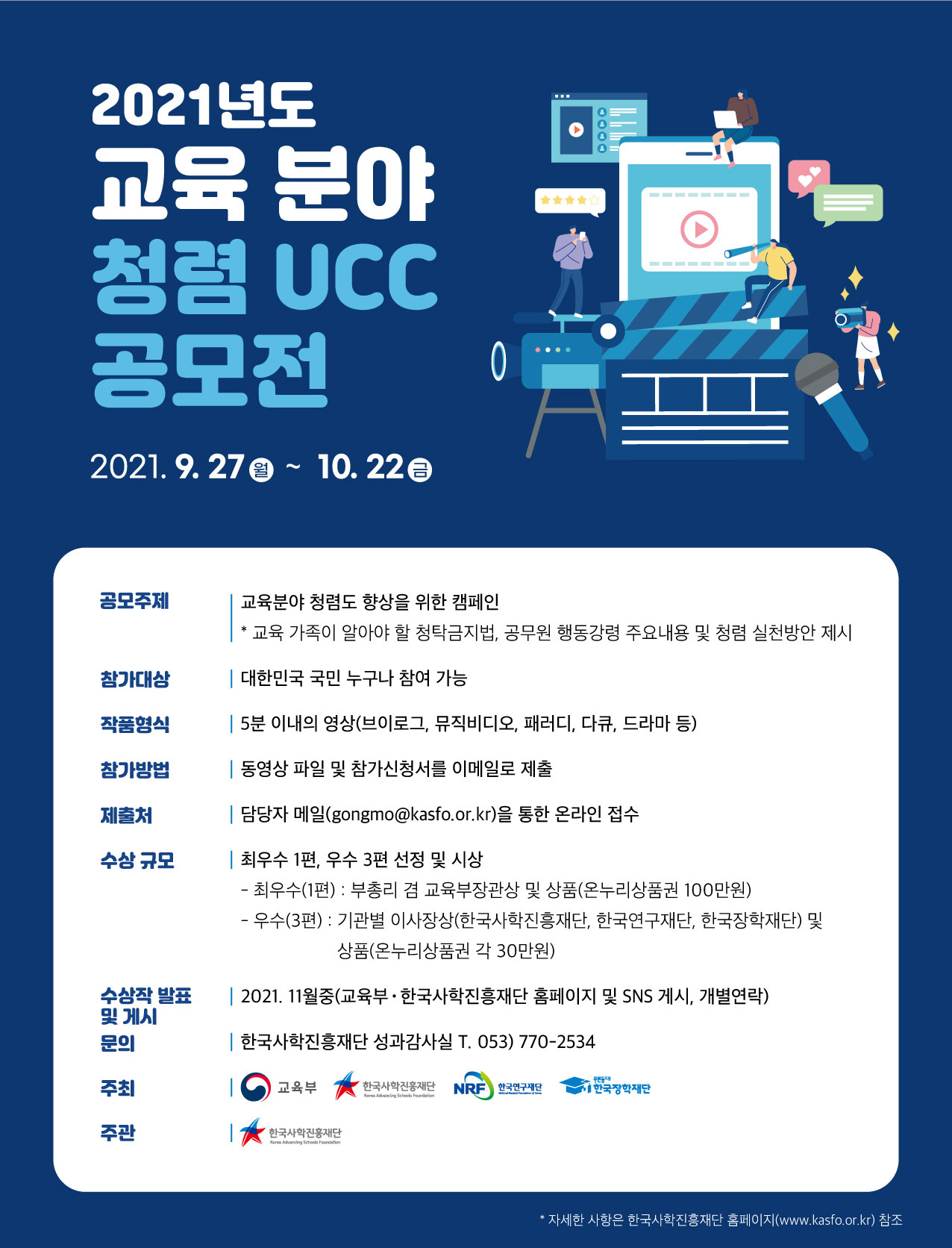 | 제목 | 2021년 교육 분야 청렴 UCC 공모전 안내 | ||||