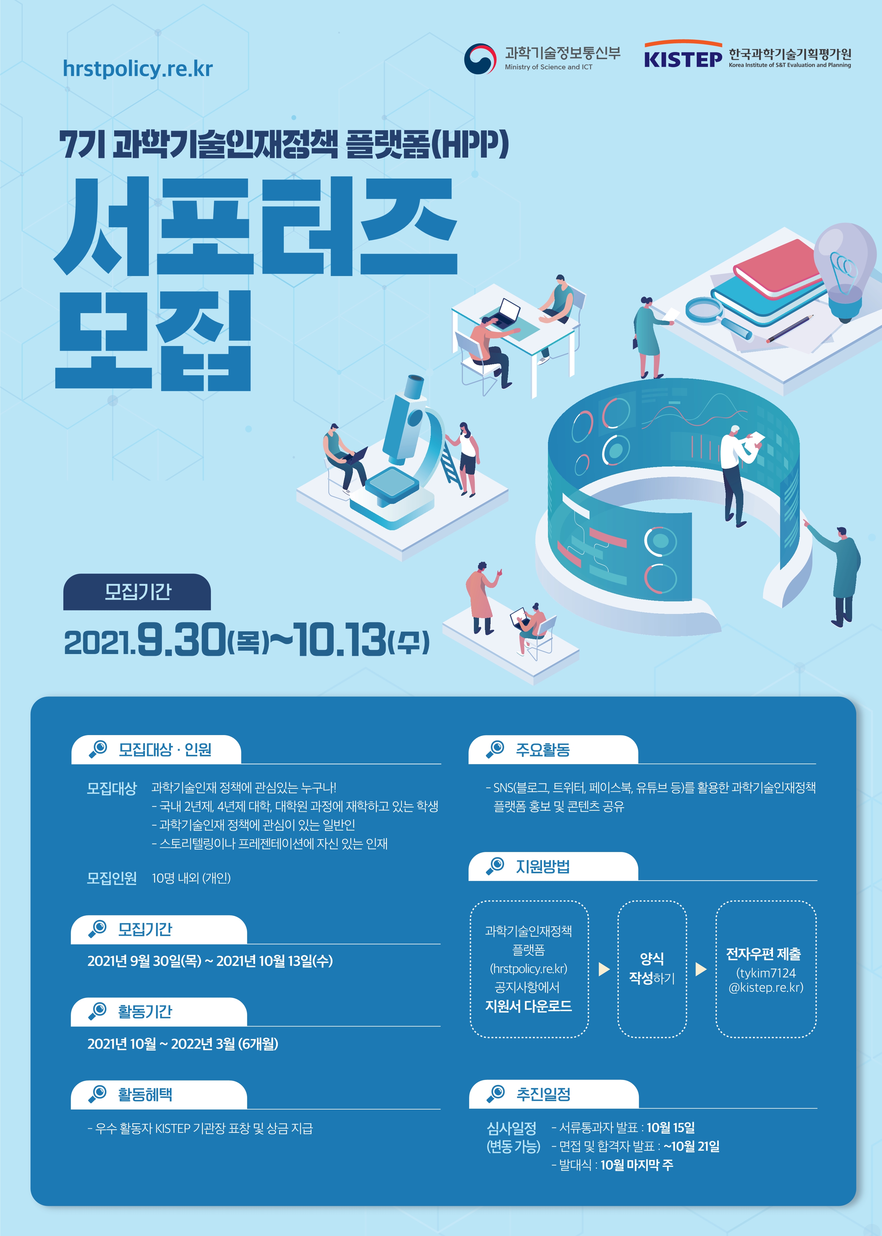 | 제목 | 과학기술인재정책 플랫폼(HPP) 서포터즈 7기 모집 안내 | ||||