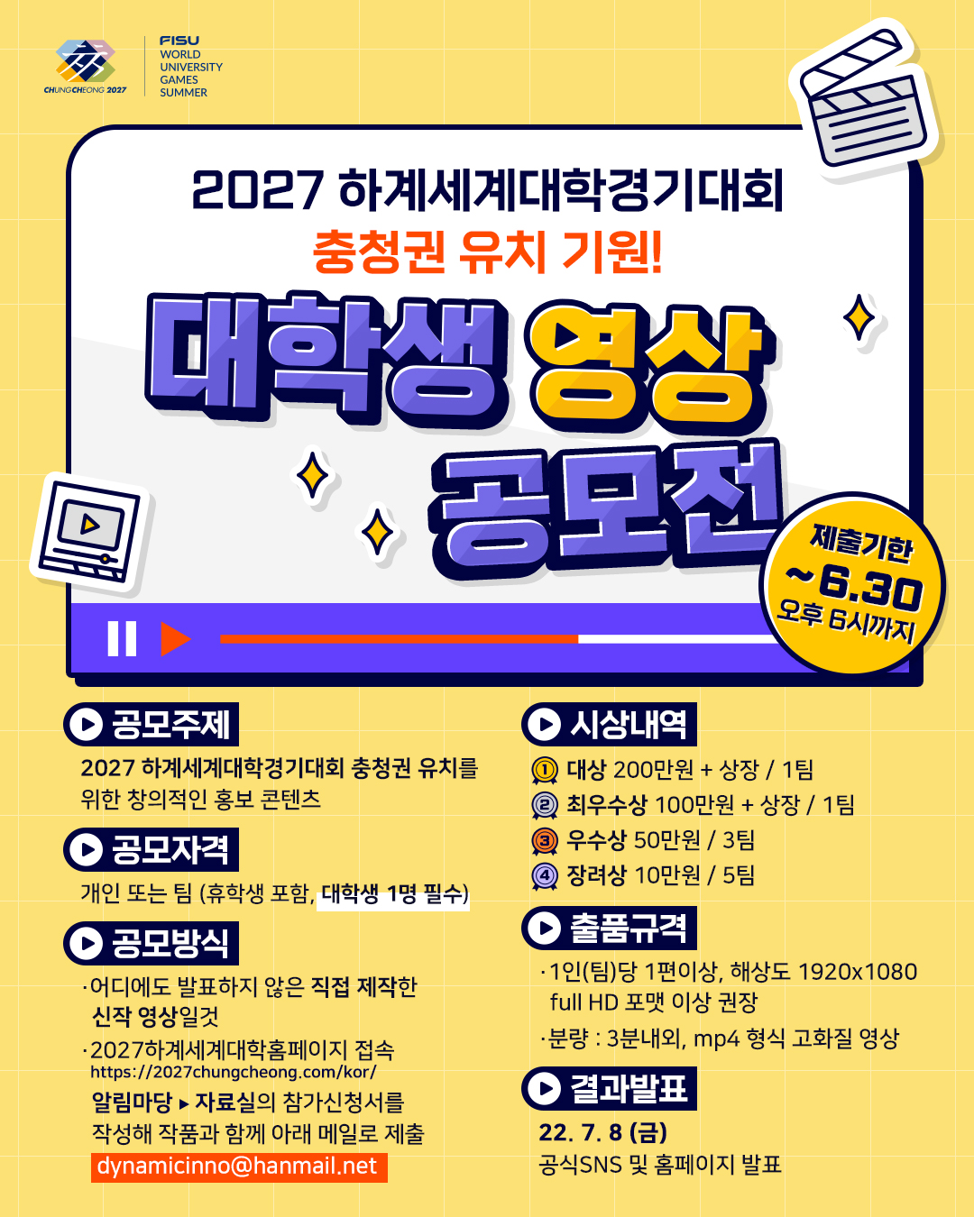 | 제목 | 2027 하계세계대학경기대회 충청권 유치기원 대학생 영상 공모전 안내 | ||||