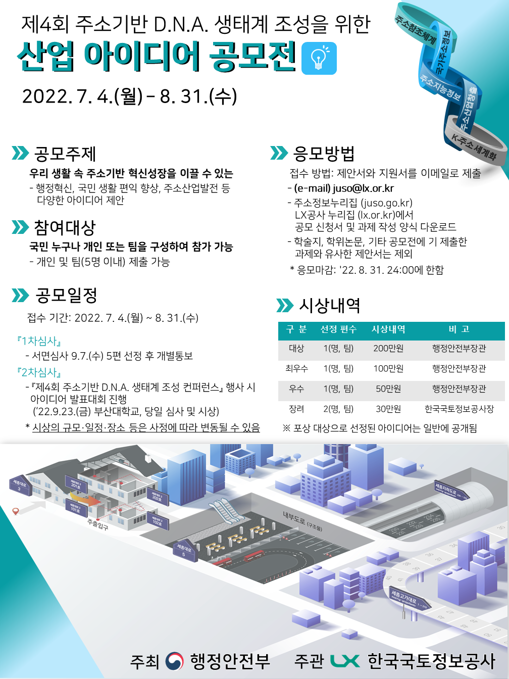| 제목 | '22년 주소기반 D.N.A. 생태계 조성을 위한 산업 아이디어 공모 안내 | ||||