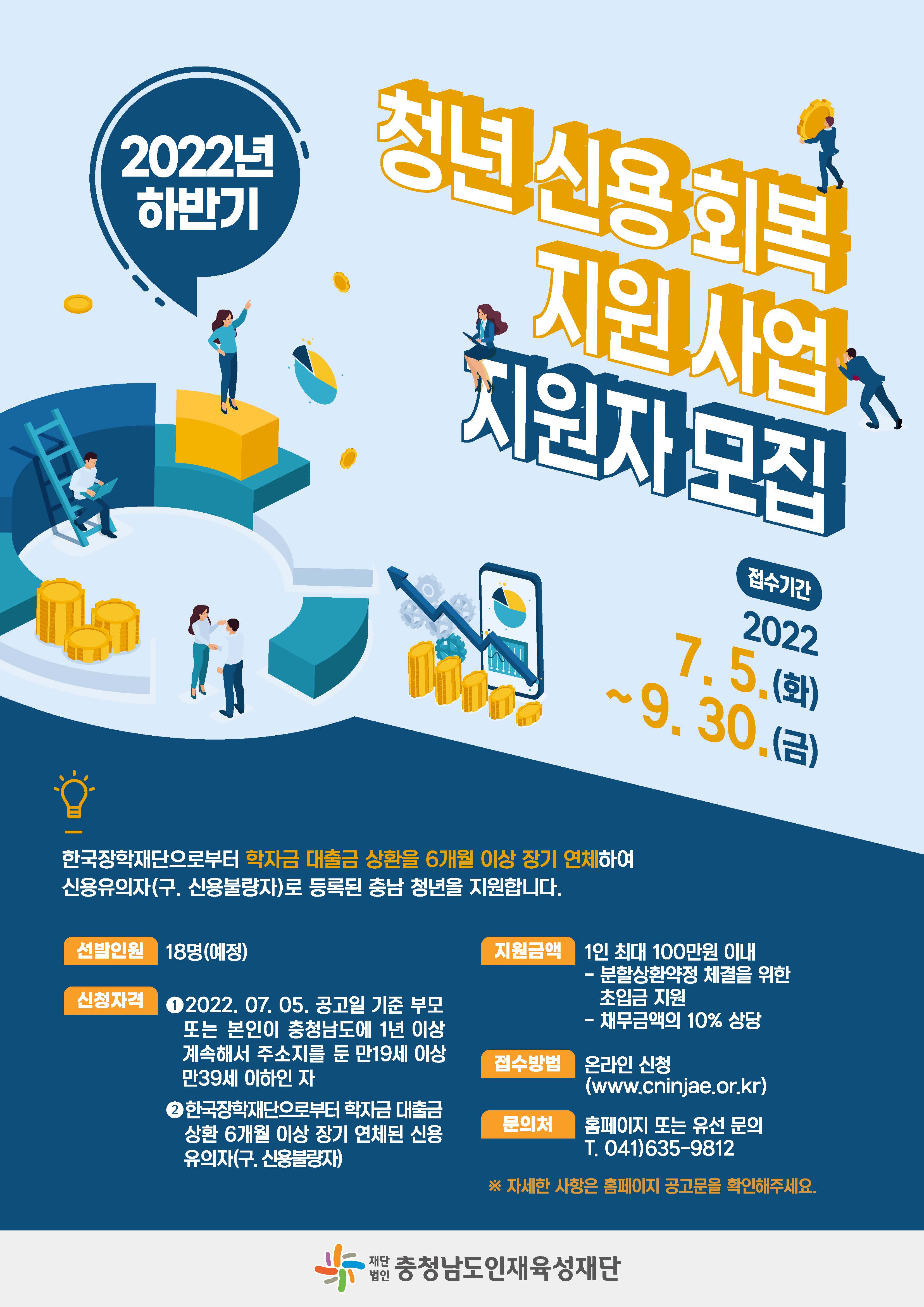 | 제목 | 2022년 하반기 청년 신용 회복 지원사업 지원자 모집 안내 | ||||