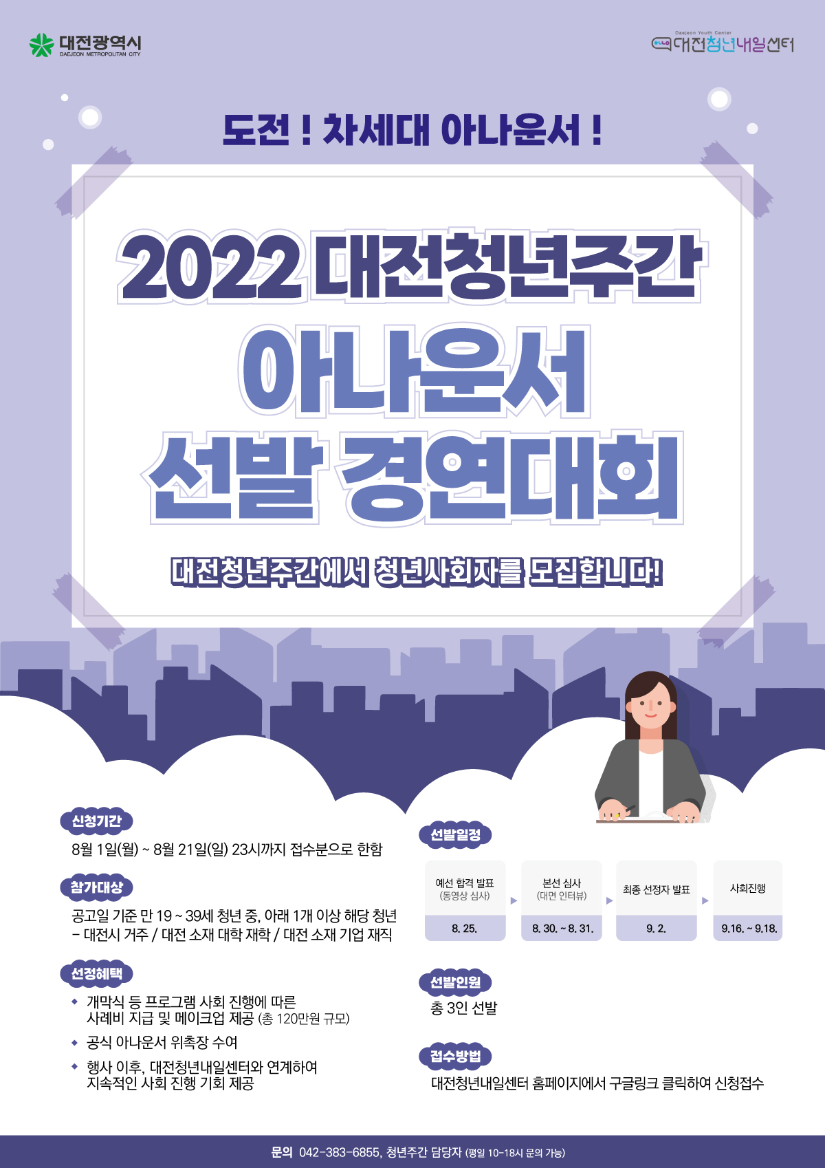 | 제목 | 2022 대전청년주간 아나운서 선발 경연대회 안내 | ||||