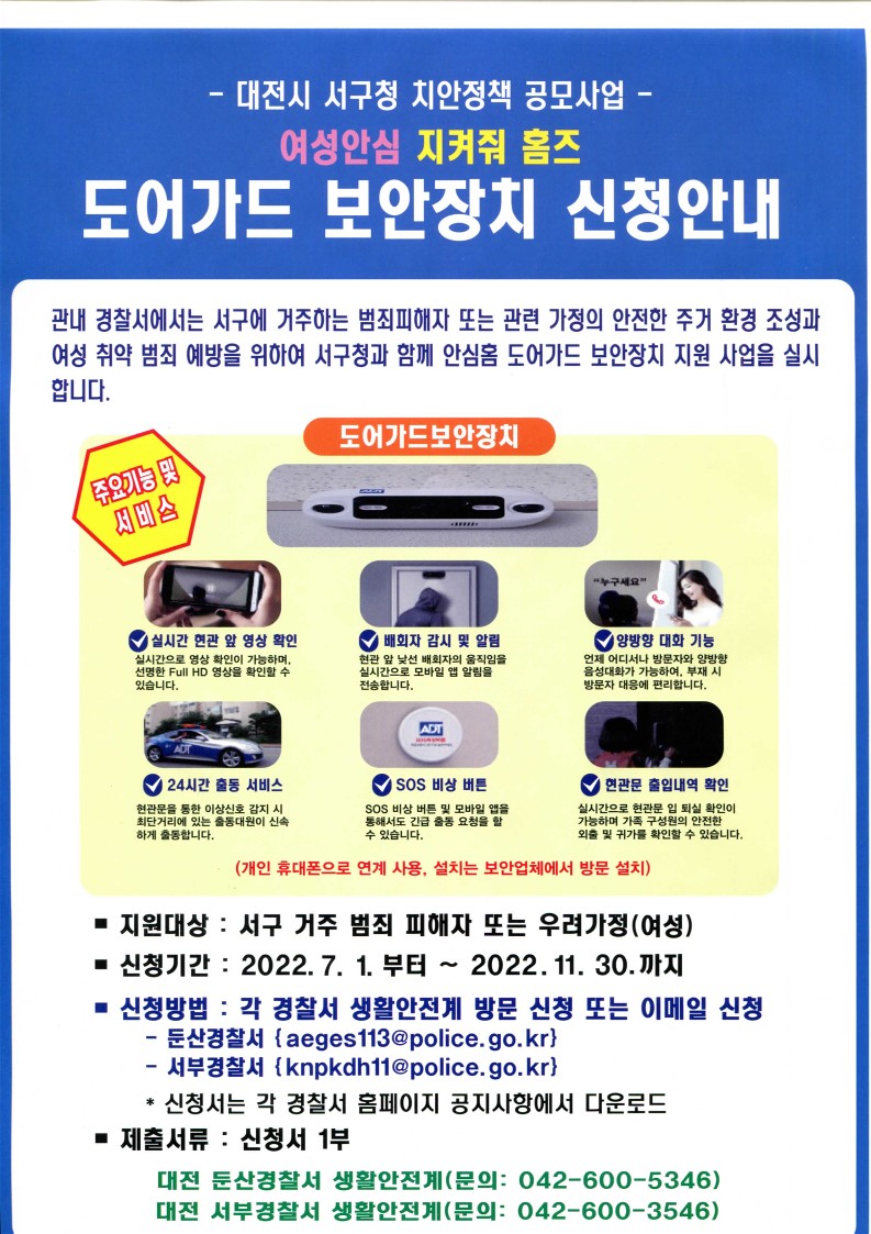 | 제목 | [대전시 서구청 치안정책 공모사업] '여성안심 지켜줘 홈즈' 도어가드 보안장치 신청안내 | ||||