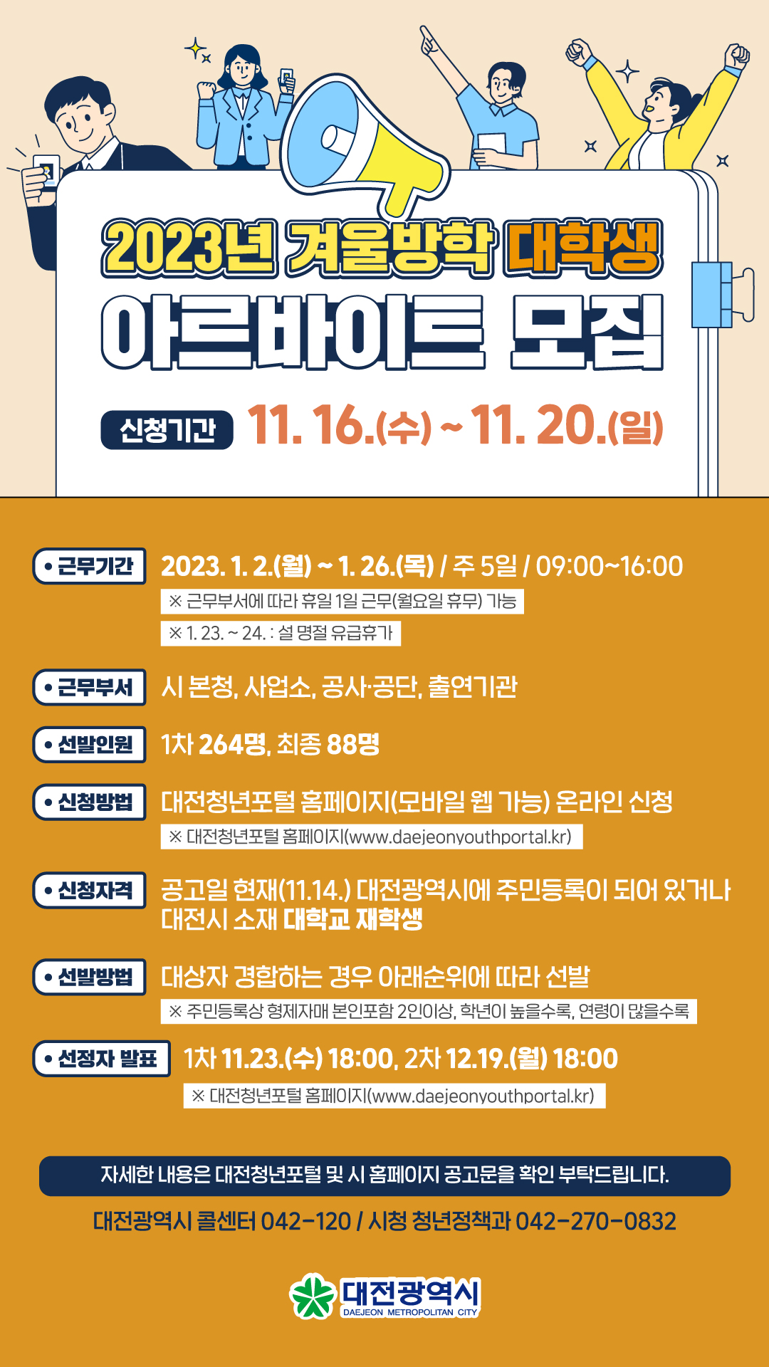 | 제목 | 2023년 겨울방학 대학생 아르바이트 참여자 모집 안내 | ||||
