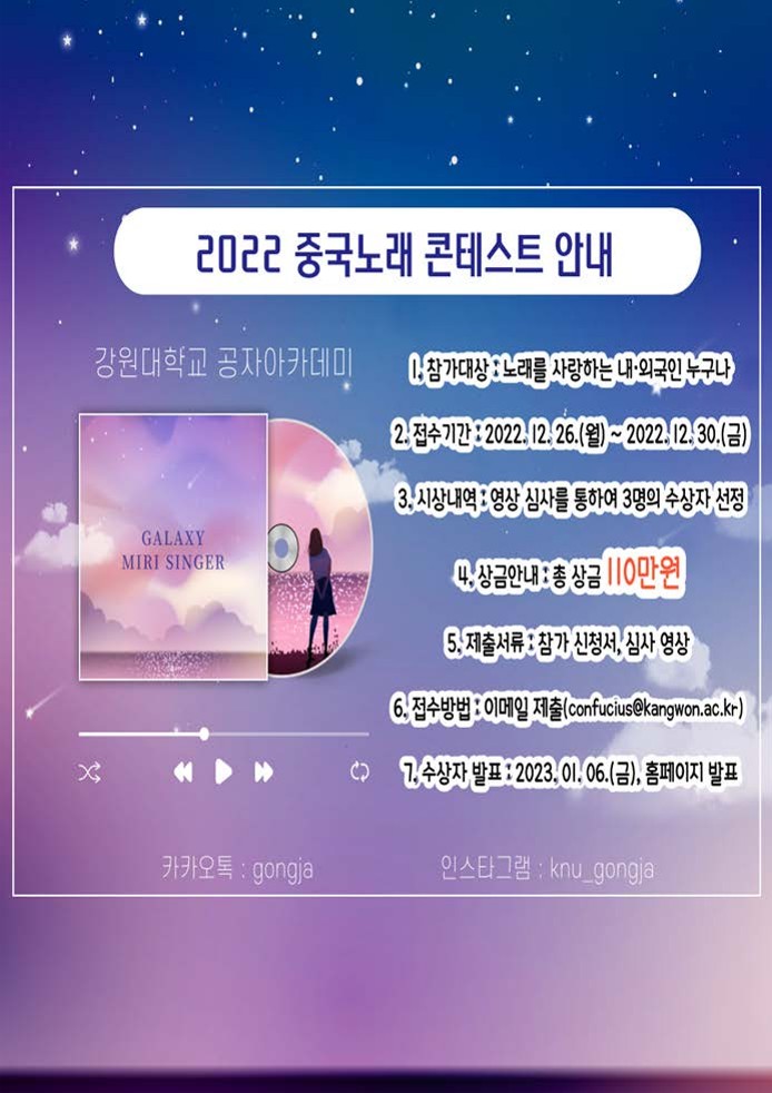 | 제목 | 강원대학교 공자아카데미 주최 '2022 중국 노래 콘테스트' 개최 안내 | ||||