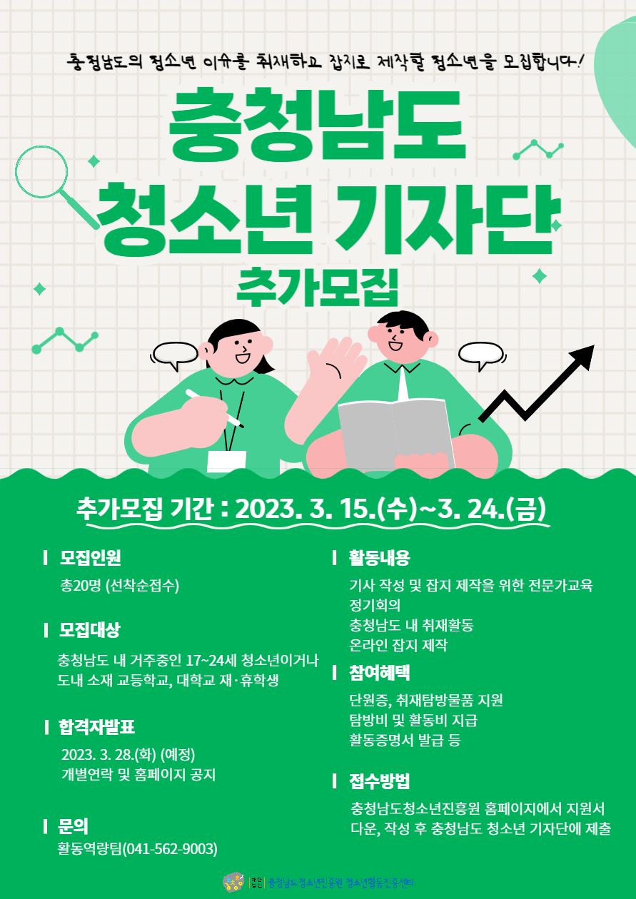 | 제목 | 충청남도 청소년 기자단 추가모집 안내 | ||||