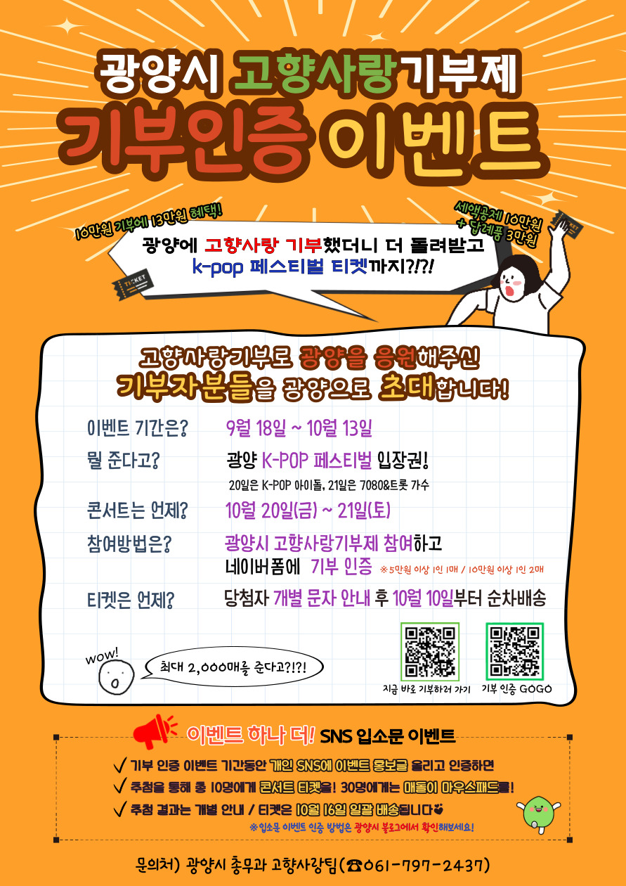 | 제목 | 「광양에 고향사랑 기부하고 광양 K-POP 페스티벌 티켓 받자!」기부인증 이벤트 안내 | ||||