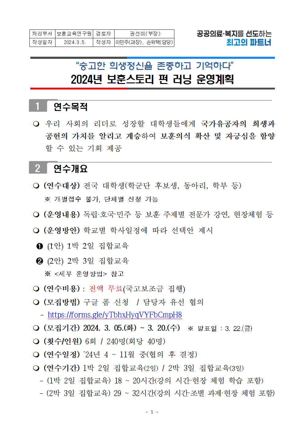 | 제목 | “숭고한 희생정신을 존중하고 기억하다” 2024년 보훈스토리 펀 러닝 운영계획 | ||||