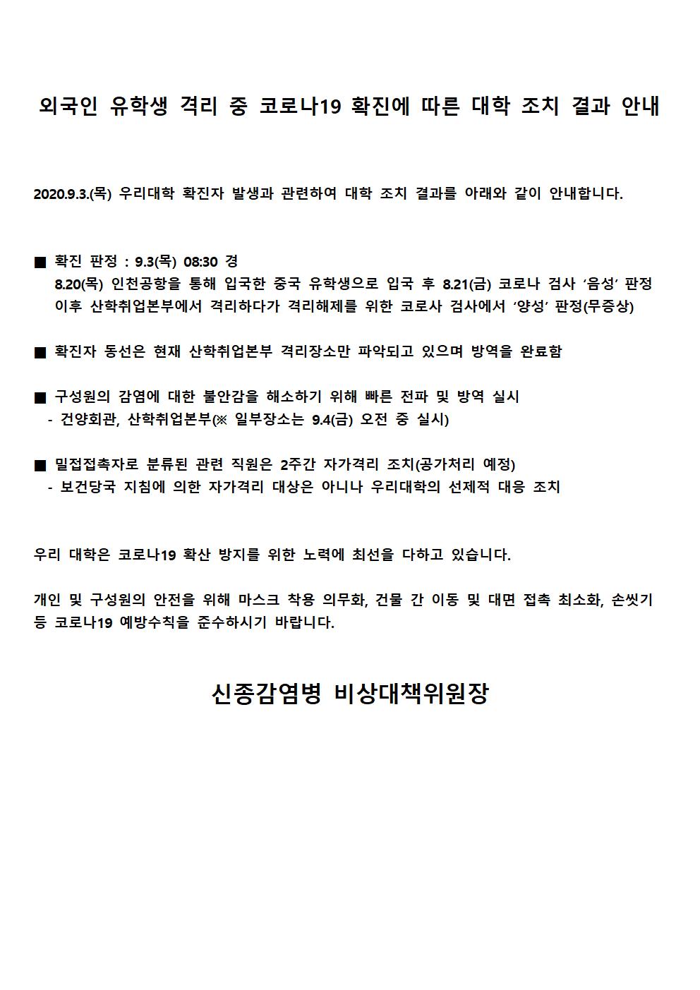 | 제목 | 외국인 유학생 격리 중 코로나19 확진에 따른 대학 조치 결과 안내 | ||||