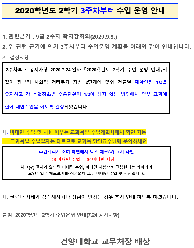 | 제목 | 2020학년도 2학기 수업 운영 안내(9월 3주차부터 적용) | ||||