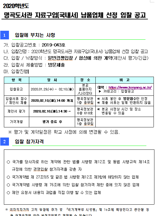 | 제목 | [2019-043호] 2020학년도 명곡도서관 국내도서 납품업체선정 입찰 | ||||