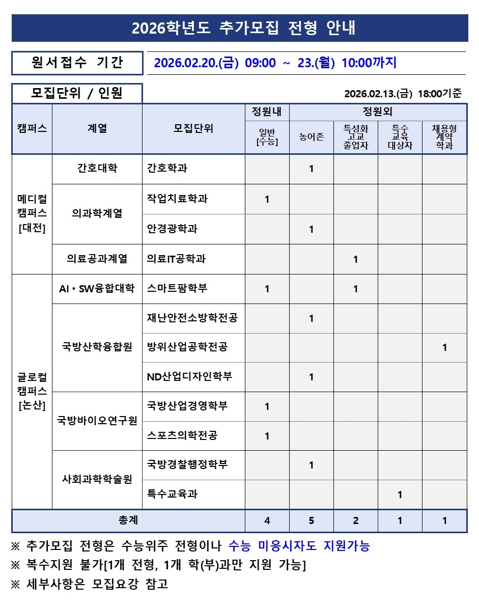 2026학년도 추가모집 모집요강을 수정하여 재탑재해 안내드리오니 첨부파일을 확인해 주시기 바랍니다.