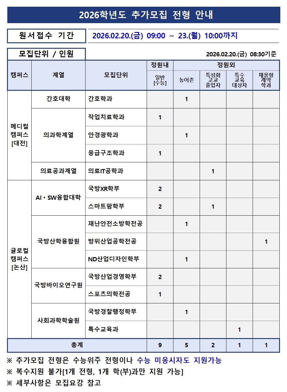 2026학년도 추가모집 모집요강을 재탑재하였으니 확인해 주시기 바랍니다.