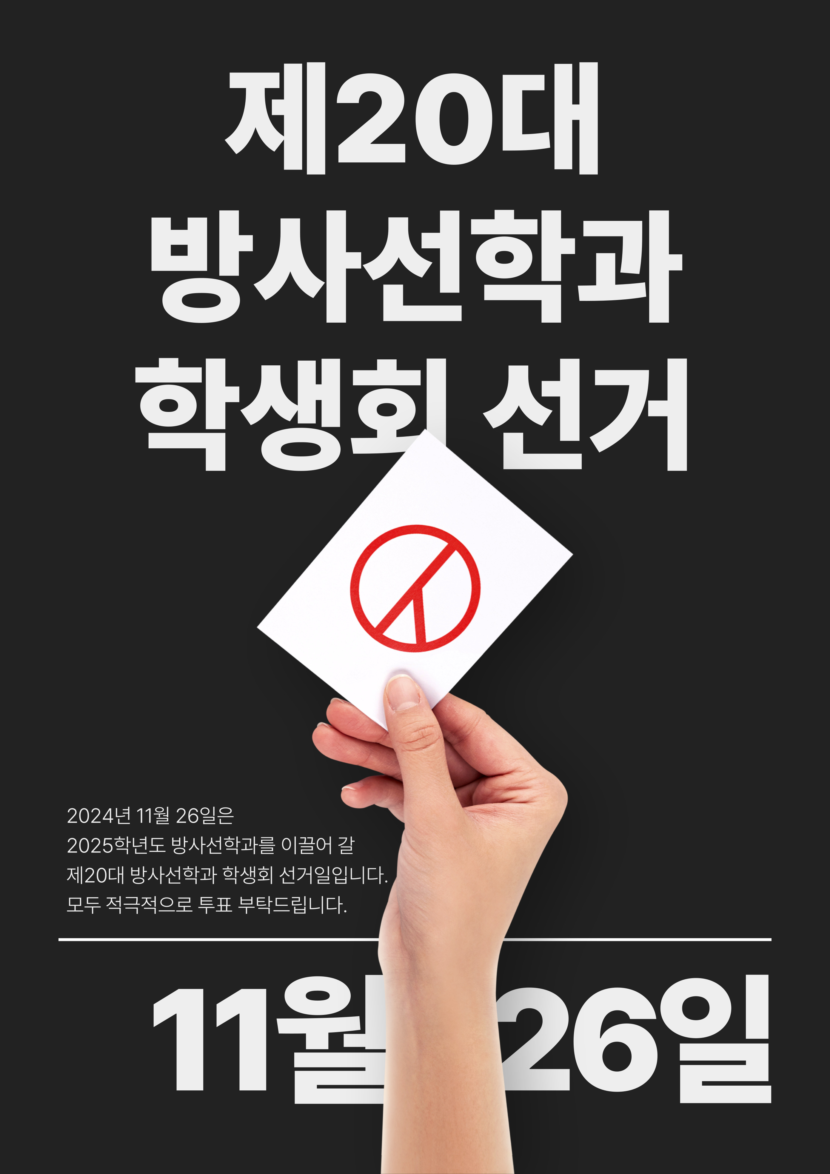2024년 11월 26일은 제20대 방사선학과 학생회 임원선거가 있는 날입니다. 방사선학과 학우분들께서는 참석하시어 소중한 한 표 부탁드립니다.